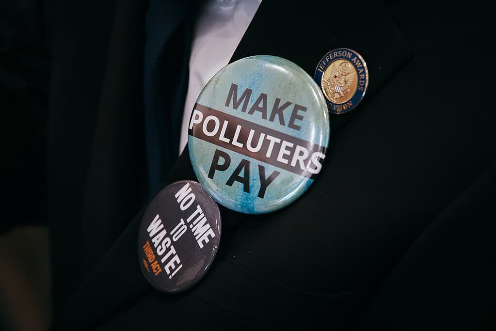 An activist wears pins during a press conference promoting a bill that would charge fossil fuel companies for climate damages on Monday, March 16, in Trenton. Photo by Andres Kudacki for The Jersey Vindicator.“Why should we pay for a climate disaster we did not cause?” she said. “I didn’t cause it. I don’t think you did. But I do know who did — the big polluters and the extractors who will pay with this bill.”