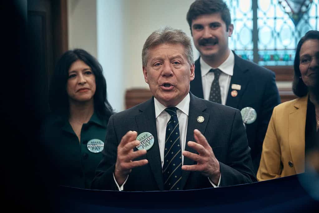Senator John McKeon speaks during a press conference promoting a bill that would charge fossil fuel companies for climate damages on Monday, March 16, in Trenton. Photo by Andres Kudacki for The Jersey Vindicator.“Yes, lawsuits may happen, but guess what? This should not be a reason why we should wait,” she said. “We need to make sure that it happens before this budget so we can start planning for the future for New Jersey.”